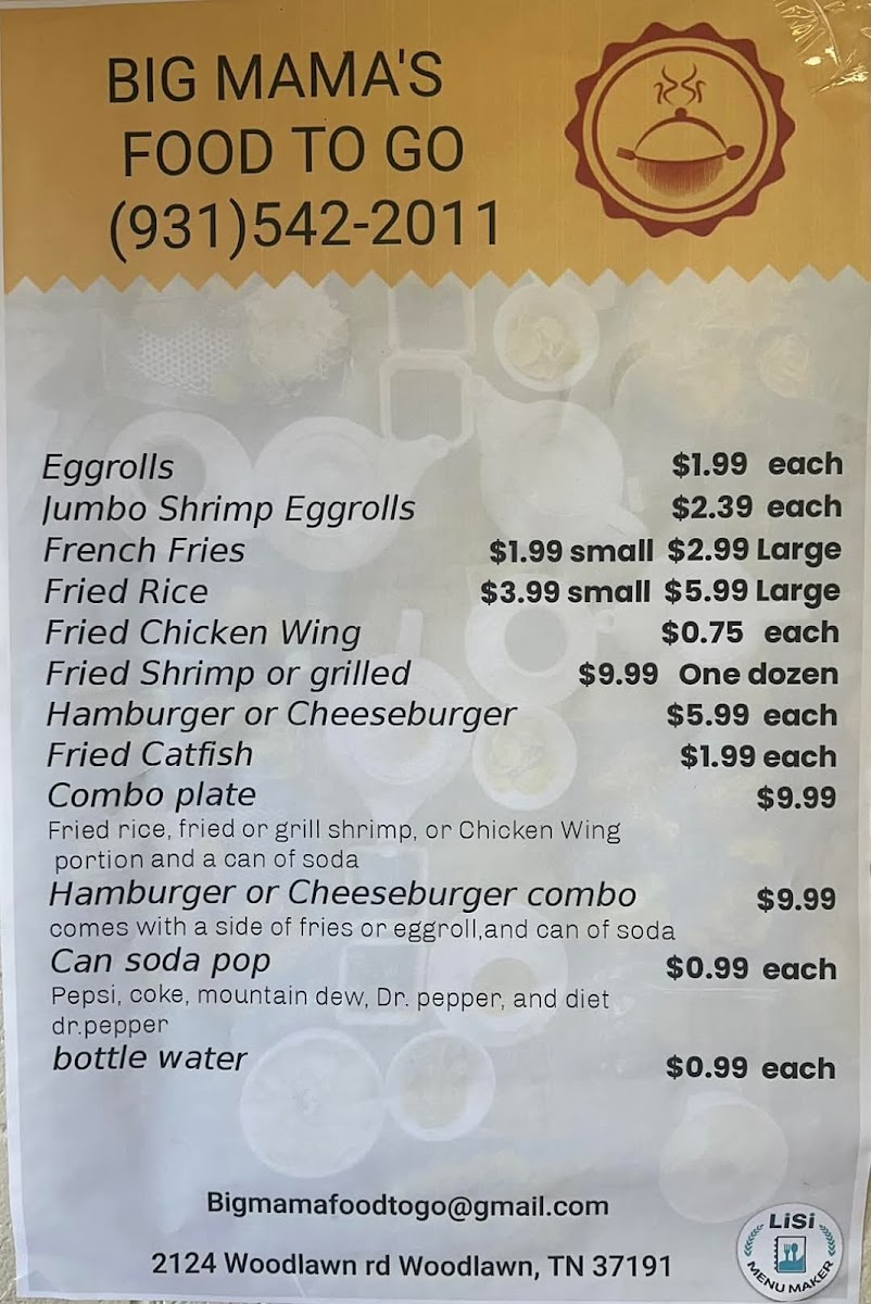 If you're craving a delicious, home-style meal that hits the spot, look no further than Big Mama's Food To Go Menu. Nestled at 2124 Dover Rd in Woodlawn, TN, this spot brings comfort food to your table with mouthwatering options that never disappoint. From savory meats to fresh, hearty sides, every dish is made with love and packed with flavor. Whether you're grabbing a quick bite on the go or bringing the family together for a meal, Big Mama’s is perfect for any occasion. You’ll find everything from crispy fried chicken to tender ribs, and the sides? Simply unbeatable, with classics like mac ‘n cheese and collard greens rounding out the spread. No matter what you choose, you’re in for a treat!
